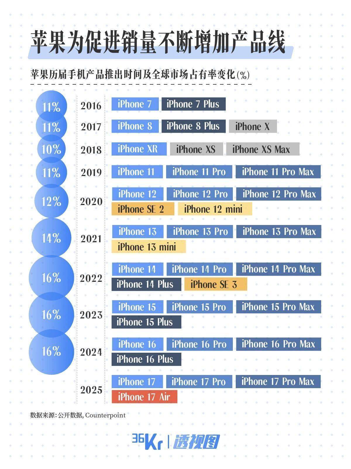 此次发布最大的争议点在于新增的air产品线。这款以“极致轻薄”为卖点的机型厚度仅5.5毫米,约为一粒米竖立的厚度,但为达成这一设计目标,牺牲了部分性能参数。其市场前景存疑:参照过往plus机型的命运,air系列可能面临类似困境。数据显示,近年来iphone用户更倾向购买高端机型,pro与pro max系列销量占比从2020年的40%跃升至70%以上,而标准版仅占20%,plus系列更是不足5%。这种消费趋势变化,使得air系列能否成功填补中间价位段成为未知数。