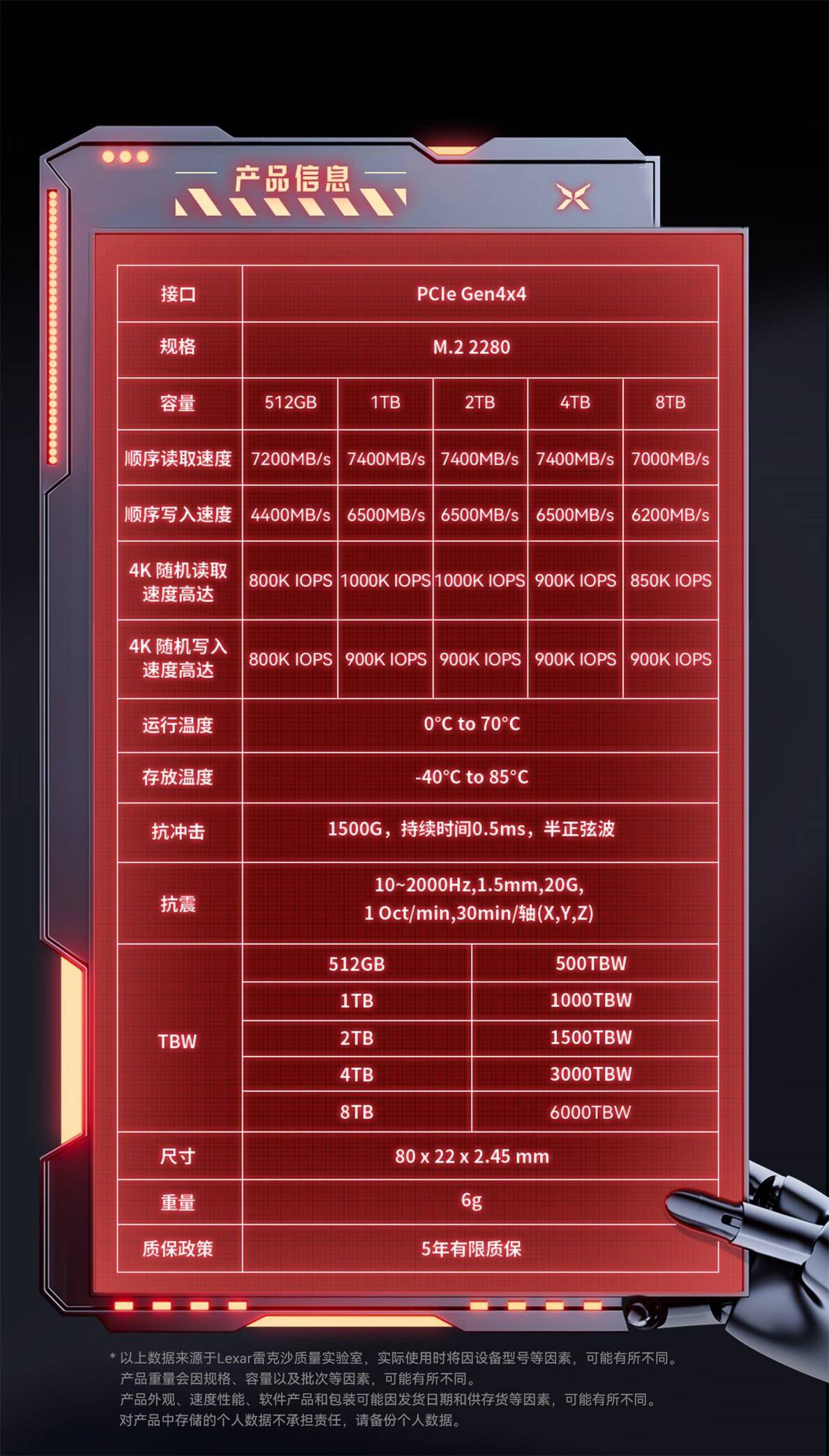 在性能参数上,尽管8tb版本的ares在读写速度上略低于同型号的小容量版本,但其顺序读写速度依然高达7000mb/s和6200mb/s,随机读写速度也分别达到了850k iops和900k iops。该产品还提供了5年的质保期,并承诺质保期内写入量可达6000tbw,这无疑为用户提供了坚实的质量保障。